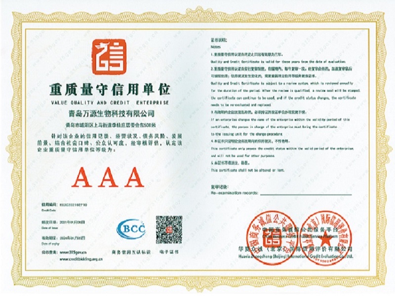針對該企業的信用記錄、經營狀況、債務風險、發展前景、結合社會口碑、公眾認可度,經審核評估,認定該企業重質量守信用單位等級為:AAA級
