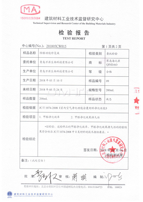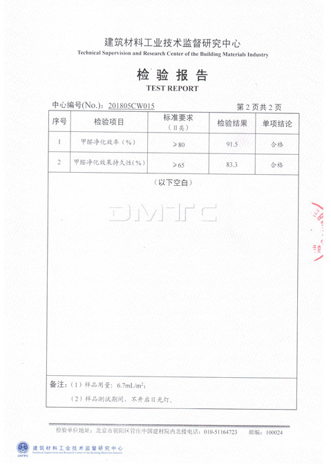 檢驗結果:經檢驗,送檢樣品的甲醛凈化效率、甲醛凈化效果持久性的檢驗結