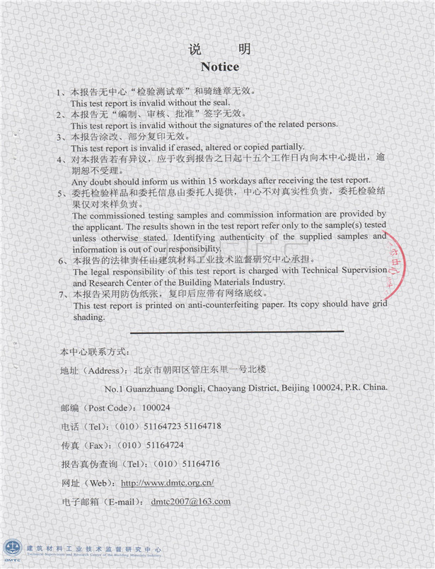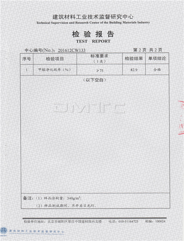 檢驗結果:*經檢驗,送檢樣品的甲醛凈化效率的檢驗結果符合標準JC/T1074-2008中I類材料的技術指標要求。