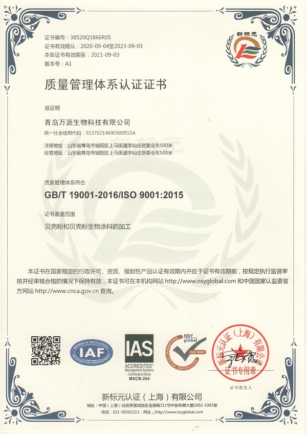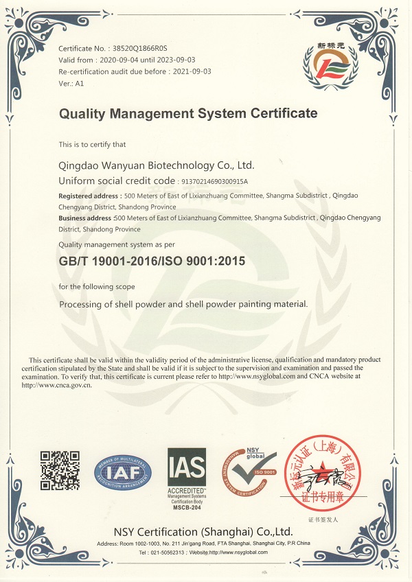 證書覆蓋范圍:貝殼粉和貝殼粉生物涂料的加工